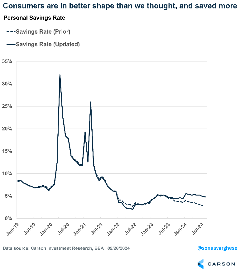 Gross domestic income (GDI), a different way of measuring total economic activity, was also revised up on the back of stronger income growth for households and corporations (i.e. profits). Disposable income for households was revised higher, even as durable goods consumption was revised down. (Turns out Americans didn’t spend as much on durable goods like cars and recreational goods as we first thought.) As a result, the savings rate was revised up from 3.3% to 5.2% in Q2 2024. That’s lower than the 2019 average of 7.3%, but not that much lower. And remember that 2019 came at the end of a massive deleveraging cycle, as households were repairing their balance sheets after the financial crisis, which had crushed stock and home prices.