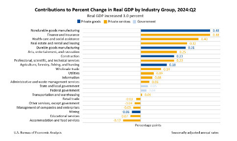 Survey data from the manufacturing sector have told us that the manufacturing sector has been in contraction for the last two years. The ISM Manufacturing PMI (a survey of purchasing managers) averaged 48.8 in Q2 2024 (any reading below 50 indicates the sector is in contraction). But with the GDP/GDI data, we also got “industry value add” data, which is actually a third way to measure overall economic activity, this time aggregating output across various private sector categories, and the public sector. Turns out, real GDP grew 3.0% annualized in Q2 2024, and of that, 0.79%-points came from the manufacturing sector. That’s a quarter of the growth rate contributed by a sector that makes up just about 10% of the economy, and supposedly is in a recession. Over the last year, through Q2 2024, real manufacturing output has increased by 3.9%.