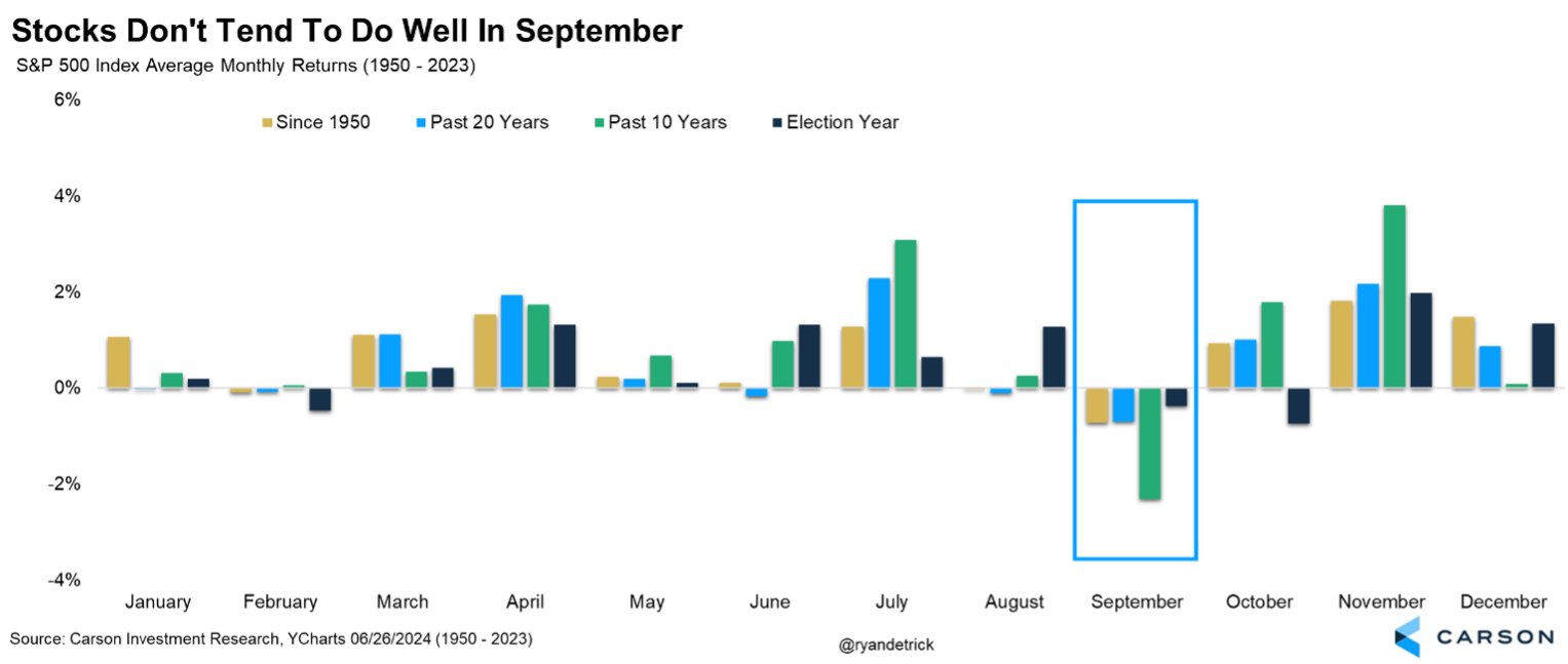 What a month it was for investors. We started off the month with some huge down days over worries centered around the yen carry trade unraveling and a slowing U.S. economy, only to get past those worries almost as quickly and see stocks move right back to new highs (or near new highs). In the end, the S&P 500 was higher by 2.3% for a fourth consecutive monthly gain. As we’ve been noting all summer, election years tend to see summer rallies and that has played out nicely once again in 2024.