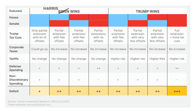 • No matter who wins we’re likely to see some Trump era individual tax cuts extended, but that also means more deficits.