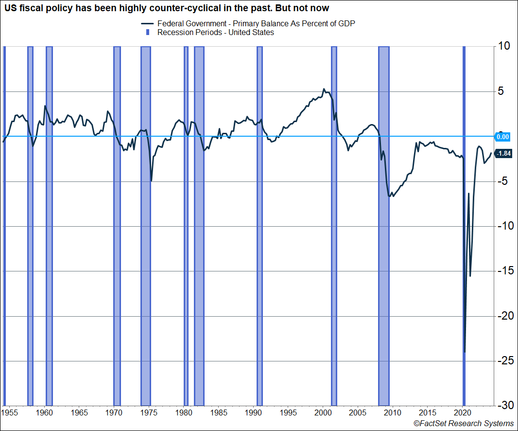 The Federal government’s “primary balance,” which is revenue minus spending excluding interest payments on Treasury debt, is one way to measure how much net spending is happening at the Federal level. The chart below shows the primary balance as a percent of GDP. As you can see, prior to the 2010s, the primary balance was always in positive territory as economic expansions wore on. It fell into deficit only during recessions, which isn’t surprising because that’s when economic stabilizers (like unemployment benefits) kick in, and revenue collection drops (as there’s less income). In short, US fiscal policy has historically been counter-cyclical, which is generally what it should be.