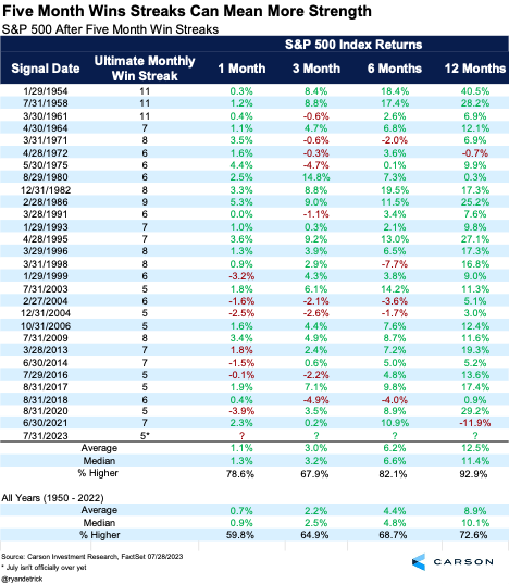 The S&P 500 is set to close higher for its fifth consecutive month today. Historically, stocks have done quite well after similar streaks. In fact, the S&P 500 has been up a year later 26 out of the past 28 times. However, the last time this happened was in 2021, and that was followed by a drop of nearly 12%. Despite this recent example, the market’s strength is likely another indication of higher stock prices in the future.