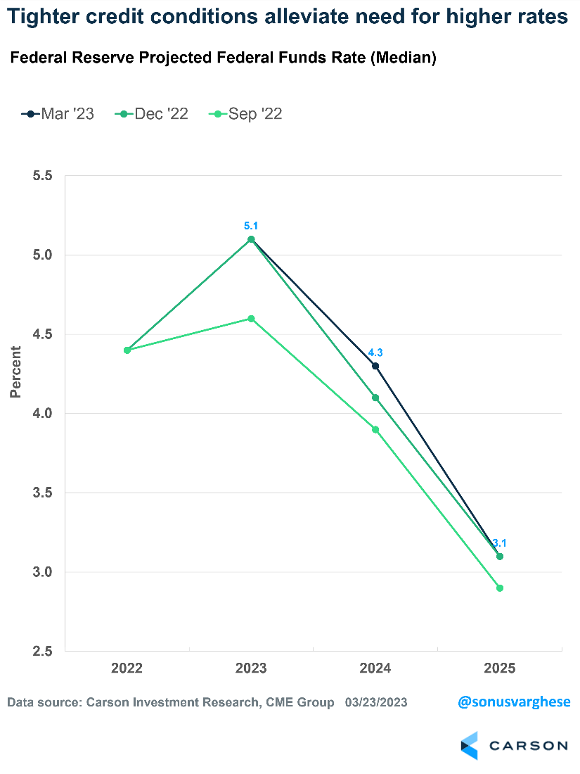 • Fed expectations move lower — if the banking sector comes under renewed stress, credit conditions tighten significantly and eventually lead to weaker data.
