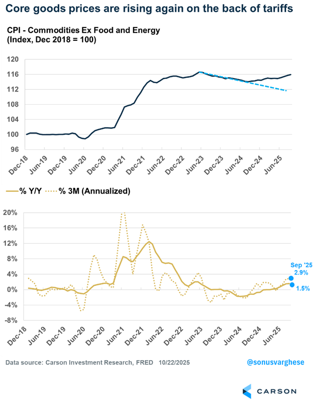 Energy prices are volatile and while gas prices rose in September, those have generally been on the softer side recently—gasoline prices are down 0.5% over the past year. This has helped offset the upside shock to electricity and utility prices (thank you, AI datacenters), which are up 6.4% over the past year (though they’ve eased in recent months).