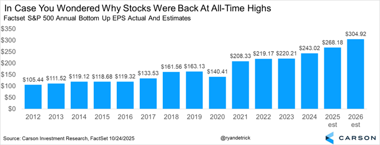 So what is driving markets higher? It is earnings, and boy, have they been strong. According to FactSet, an incredible 87% of companies that have reported so far (about 30% of the S&P has reported) beat earnings estimates and nearly 83% have beaten on revenue. At the end of the day, the economy continues to surprise to the upside, and the negative impact from tariffs we’ve heard so much about simply hasn’t happened outside some muted economic growth. Earnings drive long-term stock gains, and that is why stocks are having another solid year and are back to all-time highs.