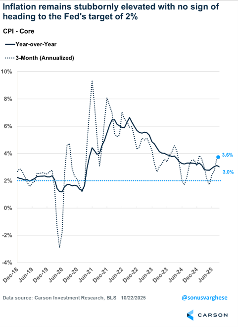 Inflation remains elevated. Headline CPI rose 0.3% in September, which translates to a 3.8% annualized pace. Over the last three months, inflation has risen at a 3.6% annualized pace, and over the last year, it’s up 3.0%.