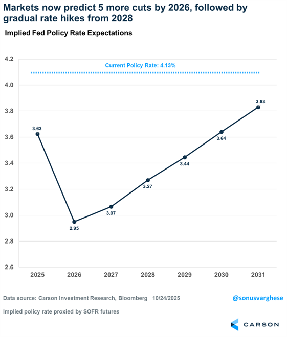 This is significant. A 3% policy rate is what the Fed considers “neutral”—a policy rate that’s neither too accommodative nor too tight. But now we’re expecting to get below that (accommodative rates) even as inflation remains well above the Fed’s target. In other words, Fed policy is expected to run quite dovish over the next year, and even beyond. Investors expect the Fed to raise rates from 2028 onwards, but only gradually. This is a tailwind for the cyclical parts of the economy, like housing and manufacturing, and even risk assets like equities. A dovish Fed that essentially keeps “real rates” low (nominal rates minus inflation) is a tailwind even for assets like gold.
