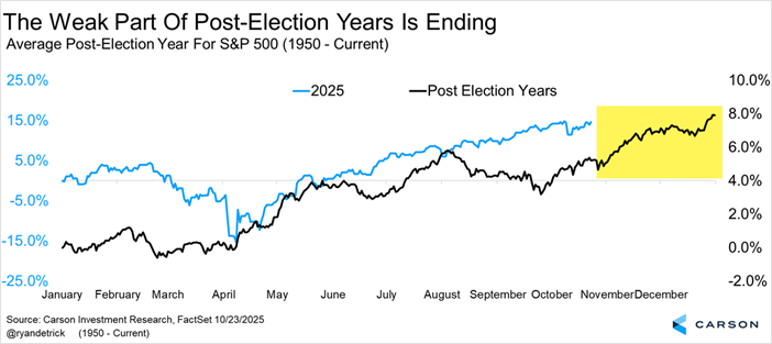 Lastly, November and December of a post-election year have been strong. No, we don’t suggest ever investing purely on the calendar, but this lines up nicely with our assumption this bull market could have a few more tricks up its sleeves before 2025 is over.