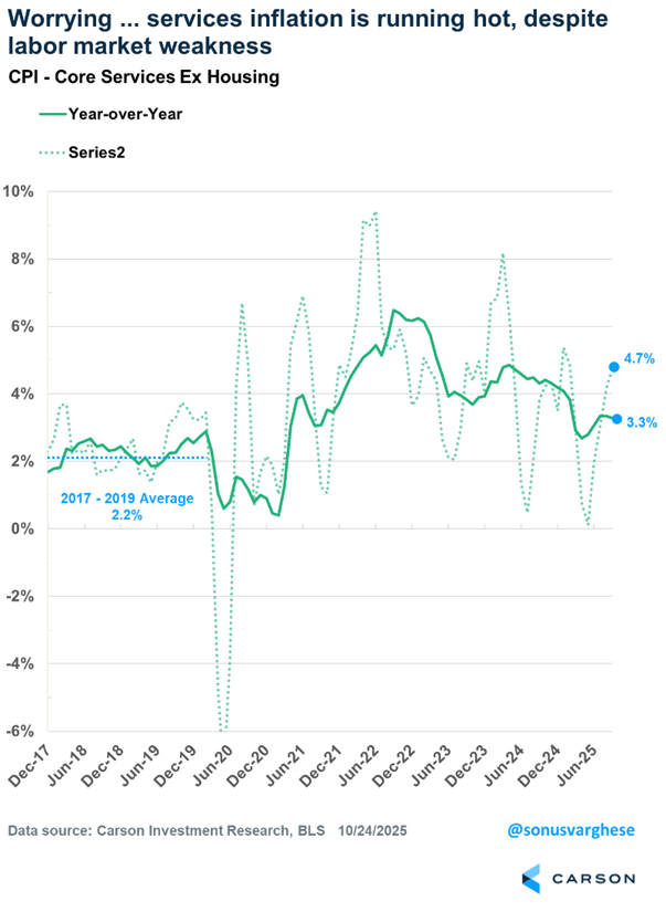 That begs the question: if shelter, which is a large category, is easing, what’s keeping inflation elevated? The answer is core services (services excluding shelter). Core services inflation is running hot, to say the least: