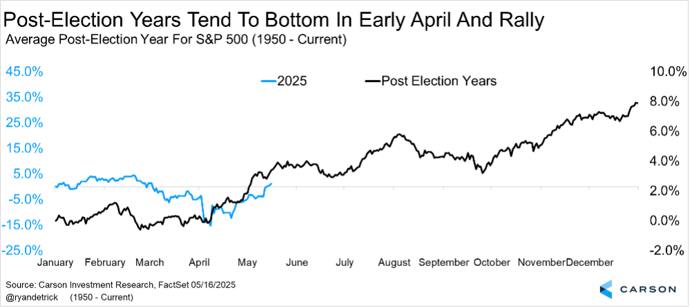 No we didn’t see a 10% market crash after Liberation Day on April 2 coming, but we thought some type of early year weakness was very possible. We’ve noted in these very commentaries many times that the year after a 20% gain, as well as early in a post-election year, and the first quarter of the year the past 20 years have all tended to be weak historically for stocks.