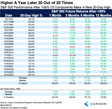 Incredibly, a year later stocks have been higher 20 out of 20 times, with extremely strong returns going out a year as well. Don’t take any study like this by itself too seriously, but stacked on top of the many other data points we’ve been sharing the past few weeks, 2025 might just end up being a solid year for the bulls.