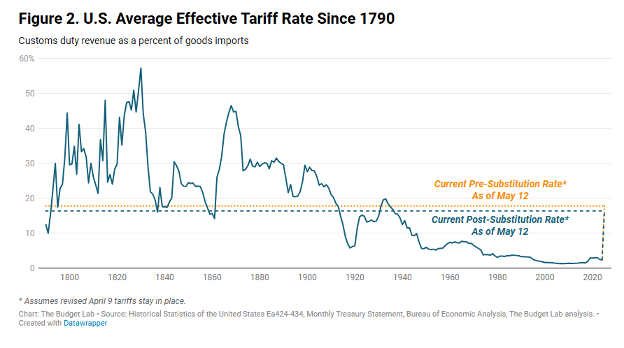 Average tariff rates, even after the China pause, are at the highest level since 1934 — rising from 2.4% at the start of the year to 17.8%. If you assume imports will fall as Americans switch to locally produced goods, the average tariff rate would be at 16.4%, the highest since 1937. The good news is that we have tariffs, and now there’s less uncertainty about it. Markets can price in what we know, not what we don’t know.