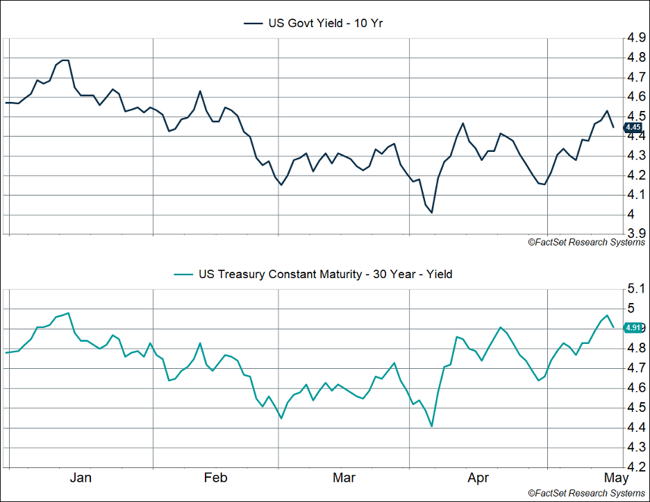 Whatever challenges deficits create, they are generally good for profits, which tends to flow through to stock prices. Interest rates are a different story. Rates have been rising recently, even after a soft inflation report. The 10-year Treasury yield rose above 4.5% before pulling back to 4.45%. The 30-year Treasury yield surged to 4.97%, inching close to the peak level of 5.11% we saw back in October 2023 (which was the highest since 2007). The surge in the 30-year yield should tell you that this is not a story about higher growth expectations. Long-term growth expectations haven’t really changed much (likely around 2 – 2.5%), and so this surge is being driven by something else.