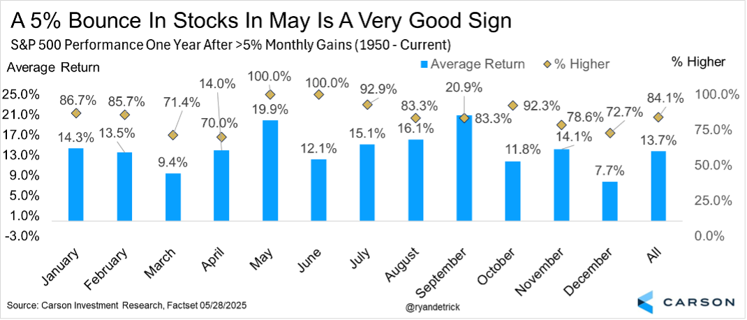 What now? Well, the good news is that strength in May is better for the bulls than strength in most other months. We looked at all 12 months and what happened after a 5% monthly gain. Well, after a strong May the S&P 500 has never been lower a year later and is up nearly 20% on average, something for the bulls to smile about for sure! Additionally, a year after any 5% monthly gain saw stocks up 13.7% on average and higher more than 84% of the time.