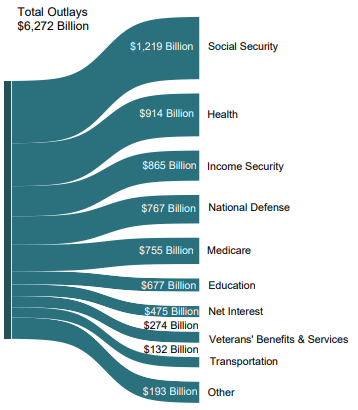- Social Security and other income benefits: $2.1 trillion (33% of outlays)