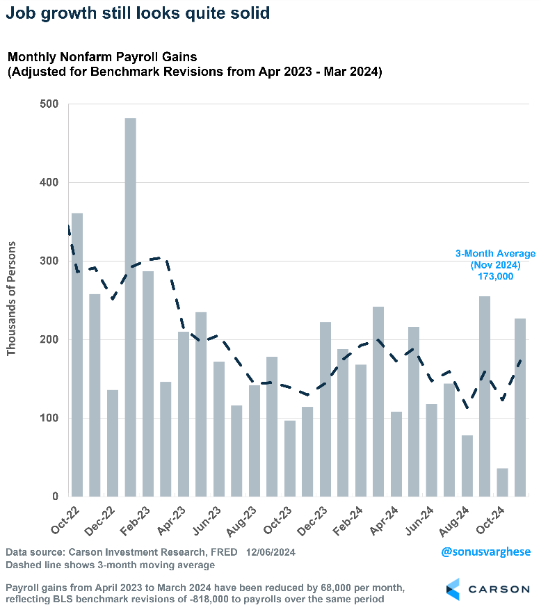 The November payroll report was going to be a tricky one to parse because of a bounce back from hurricane effects (which pulled down October payrolls) and the resolution of the strike at Boeing. The economy created 227,000 jobs in November, close to expectations, which somewhat made up for the low 36,000 number in October (revised up from 12,000). This is why we always recommend taking a 3-month average to get the overall picture, and right now, that’s sitting at a very healthy 173,000. For reference, the 2019 average was 166,000.