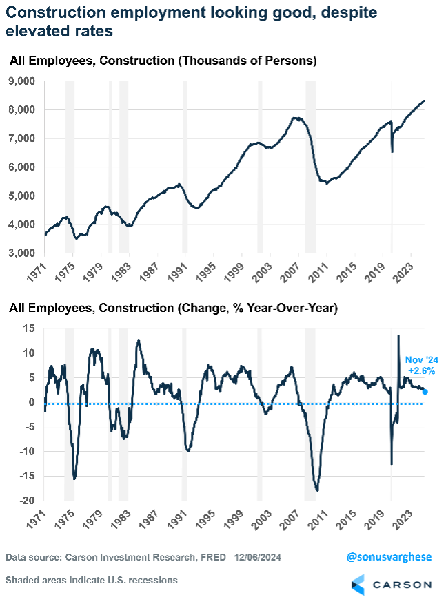 One of the more encouraging parts of the labor market, and really for the economy, is that construction employment is running solid. It was strong even in 2022 and 2023, which was another clue that a recession wasn’t imminent. Historically, construction employment has foreshadowed further weakness across the labor market (and recessions), which makes sense because elevated interest rates (and tight monetary policy) has preceded past recessions. If housing remains weak due to elevated rates, we could see construction employment start to pull back. For now, construction employment is rising at a very healthy 2.6% year-over-year pace, spurred by building construction (residential, but also non-residential like manufacturing facilities) and even home improvements. However, this is something we’re going to be watching very carefully as 2025 progresses.