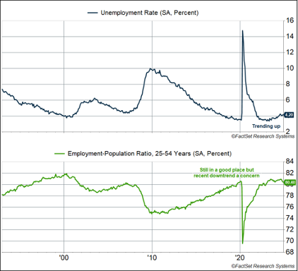 Despite the healthy look on the payroll side, which comes from the government’s survey of businesses, things are less than picture perfect when you look at the household survey. For one thing the unemployment rate rose to 4.2%, just shy of the highest rate we’ve seen over the last two years. A year ago, it was 3.7%. The prime-age (25-54) employment-population ratio, which is a way of controlling for demographic effects and labor force participation issues, has fallen to 80.4%. That’s still close to the highest we saw during the 2010s expansion, and above anything we saw in the mid-2000s, but it’s fallen quite a bit from the recent peak of 80.9%. These levels are not a bad place to be if things can hold at this level, but it’s the trend that’s concerning.
