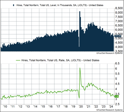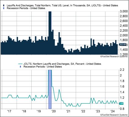 You may be wondering, “Wait, if hiring is weak, why are monthly payrolls growing at a healthy pace?” The answer is that hires measure “gross hiring,” whereas payrolls measure hires net of separations (including quits and layoffs). Quits have been in a general downtrend, which also highlights the fact that hiring has slowed (people tend to quit their jobs at a higher rate only if it’s easy to find a job). At the same time, layoffs remain really low, and that’s been the datapoint that’s been consistently positive as far as the labor market is concerned. Overall layoffs are clocking in around 1.6 million a month, well below the 1.8-2.0 million level we saw in 2018-2019. Again, the labor force is much larger, and if you normalize for that, the layoff rate is currently at 1%. That’s well below the pre-pandemic range of 1.2-1.3%.