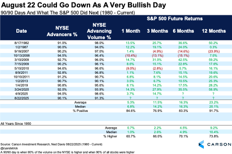 Friday was a rare “90/90 day,” which means more than 90% of the stocks on the New York Stock Exchange (NYSE) were higher, with more than 90% of the volume on the NYSE higher as well. Historically, we’ve seen this type of day near major lows, with the last two times coming off the near-bear market lows in April and off the COVID bear market low in 2020.