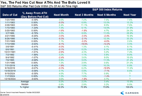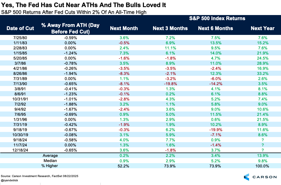 Last week we noted that the Fed has cut rates with stocks near all-time highs before. Indeed, that can be a very good sign, as stocks were higher a year later 20 out of 20 times. Then add in the three cuts near all-time highs (ATHs) late last year, and this very well could be 23 for 23 when all is said and done. No, we don’t know if the Fed will cut in September or if stocks will be near ATHs then. Still this is something to prepare for in our opinion.