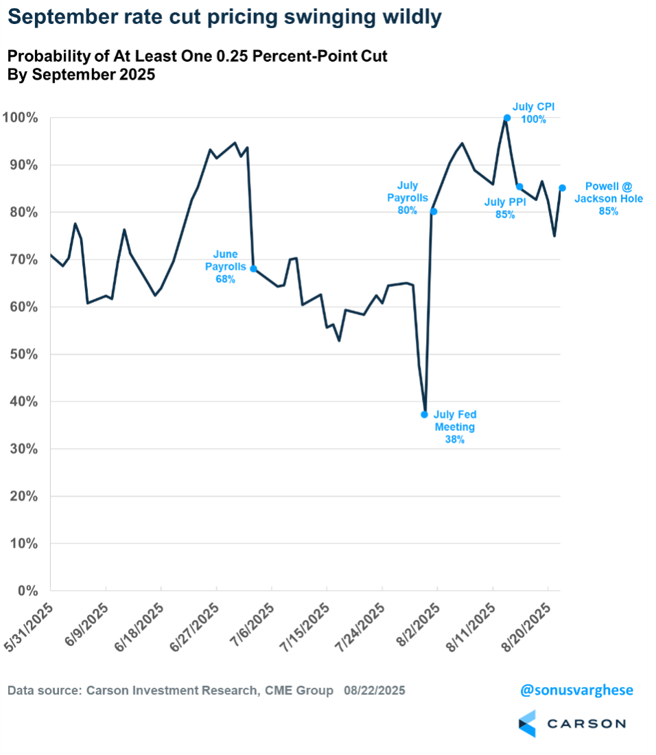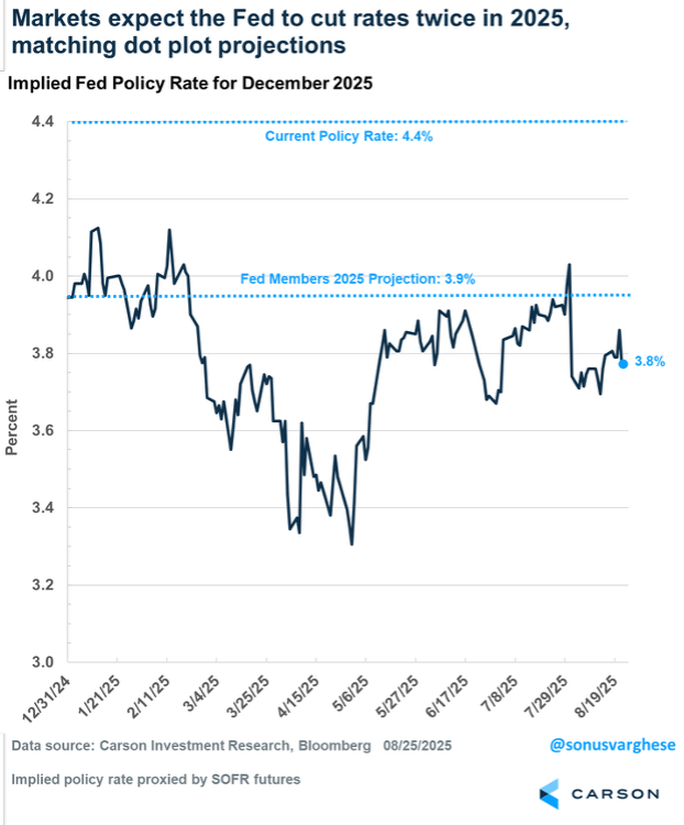 There’s divergence within the Fed as well. A couple of governors (Chris Waller and Michelle Bowman) are clearly on the dovish side, with Powell and San Francisco Fed Chair Mary Daly looking to be buying into their arguments. However, there are several on the other side who are more worried about recent inflation data, including Jeff Schmid (Kansas City Fed), Austan Goolsbee (Chicago Fed), Susan Collins (Boston Fed), and Beth Hammack (Cleveland Fed, but not a voting member of the committee this year). Back in June, the median Fed member projected 2 cuts in their outlook for 2025. However, 7 out of 19 members projected zero cuts. Granted, this was before the weak payroll numbers we got for July (and the downward revisions for May and June), but it was also before recent inflation data showing the numbers going the wrong way. All this to say, there’s a lot of divergence within the Fed given members’ different interpretations of the data, and this is likely why markets are still pricing in just about two cuts in 2025—in line with the median Fed member.