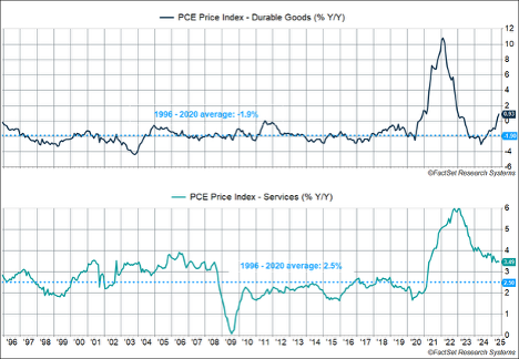 Combine this with the Fed’s likely willingness to do an insurance cut to protect labor markets even as core inflation is running above their target (for 52 months now) and going in the wrong direction, and the outlook is dovish. Looking at the Fed’s preferred personal consumption expenditures metric (PCE), and breaking it into two important pieces, durable goods and services:
