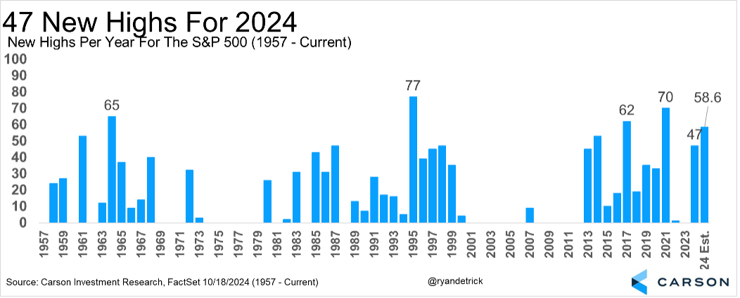 Tell me if you’ve heard this yet, but the S&P 500 gained last week with more new all-time highs. The S&P 500 has now made a new all-time high this year in all the months that don’t start with an ‘A’ (as in April and August). A total of 47 new all-time highs have taken place already this year, tying it for the seventh most ever. If you extrapolate that number out to a full year, it would be just under 60 new highs, which would crack the top five of the best years ever.