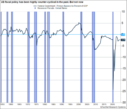 The Federal government’s “primary balance” is its revenue minus spending excluding interest payments on Treasury debt. It is one way to measure how much net spending is happening at the Federal level. The chart below shows the primary balance as a percent of GDP. As you can see, prior to the 2010s, the primary balance was always in positive territory as economic expansions wore on. It fell into deficit only during recessions, which isn’t surprising. That’s when economic stabilizers (like unemployment benefits) kick in. Revenue collection also drops during recessions, as there’s less income. In short, US fiscal policy has historically been counter-cyclical, which is what you would expect. The exception to this was the mid-to-late 2010s, when deficits rose even as the economy strengthened (especially after the TCJA was passed). But this new dynamic is likely to continue into the rest of this decade.