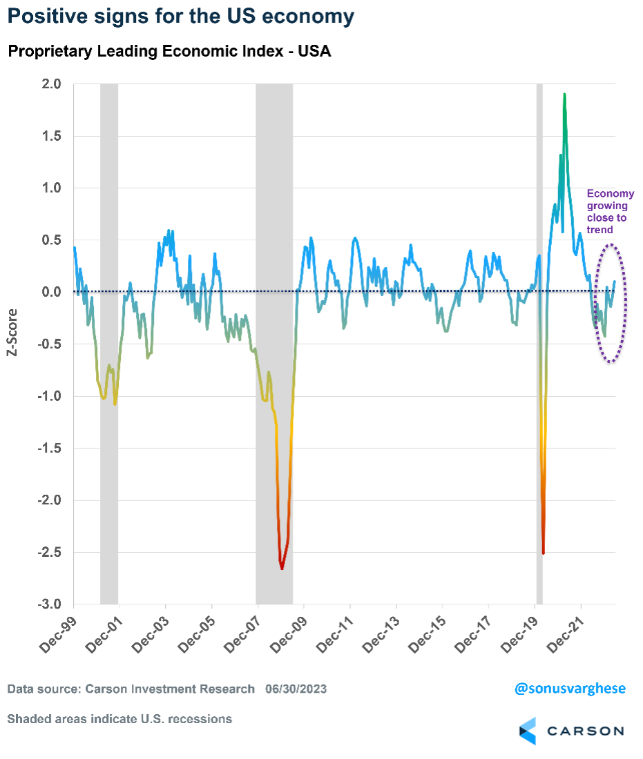 Currently, our LEI suggests the U.S. economy is growing along trend, or slightly above it. The economic picture looks even better than it did at the end of 2023. Six months ago, the risk of recession was higher, but even then the LEI didn’t signal that we were in a recession or even very close to one.