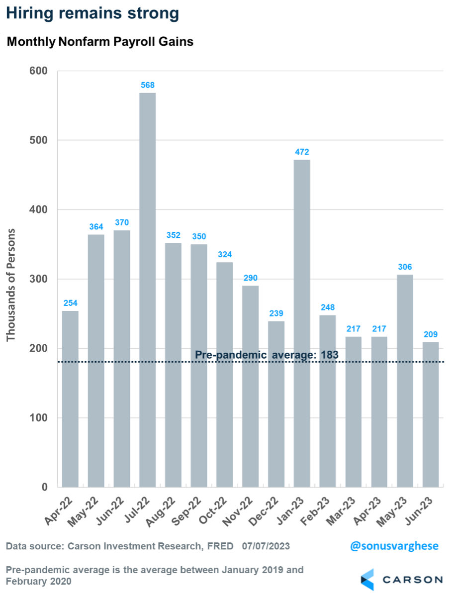 As we noted last week, June 2023 marked the second-best six-month start for the S&P 500 this century, beaten only by 2019. But just because stocks were up significantly during the first six months of the year doesn’t mean weakness will follow. In fact, stocks typically outperform the rest of the year when the first six months are strong. We think new all-time highs are possible for stocks in 2023. However, we want to be clear: August, September, and October have not historically been great months for stocks. We remain overweight stocks and expect higher prices before the end of 2023, but some type of seasonal weakness over the coming months would be perfectly normal. As President Dwight D. Eisenhower said, “Plans are useless, but planning is everything.” Make a plan now should stocks see some weakness this fall, as it could be an opportunity to add to exposure.