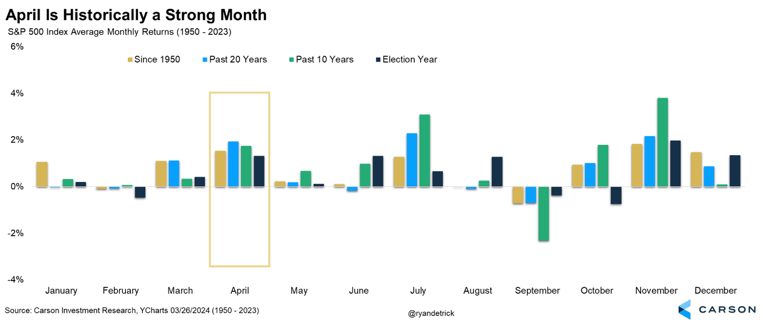 The S&P 500 has averaged 1.5% in April, the second best month of the year (only November is better). April has also been the third best month over the last 10 years, and it has been the fourth best month over the last 20 years and during election years.
