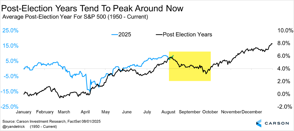 Taking this is step further, the average post-election year peaks in early August and tends to bottom in late October. We would never say to blindly invest in seasonals, but this coupled with potentially weakening market breadth could suggest some August turbulence is coming.