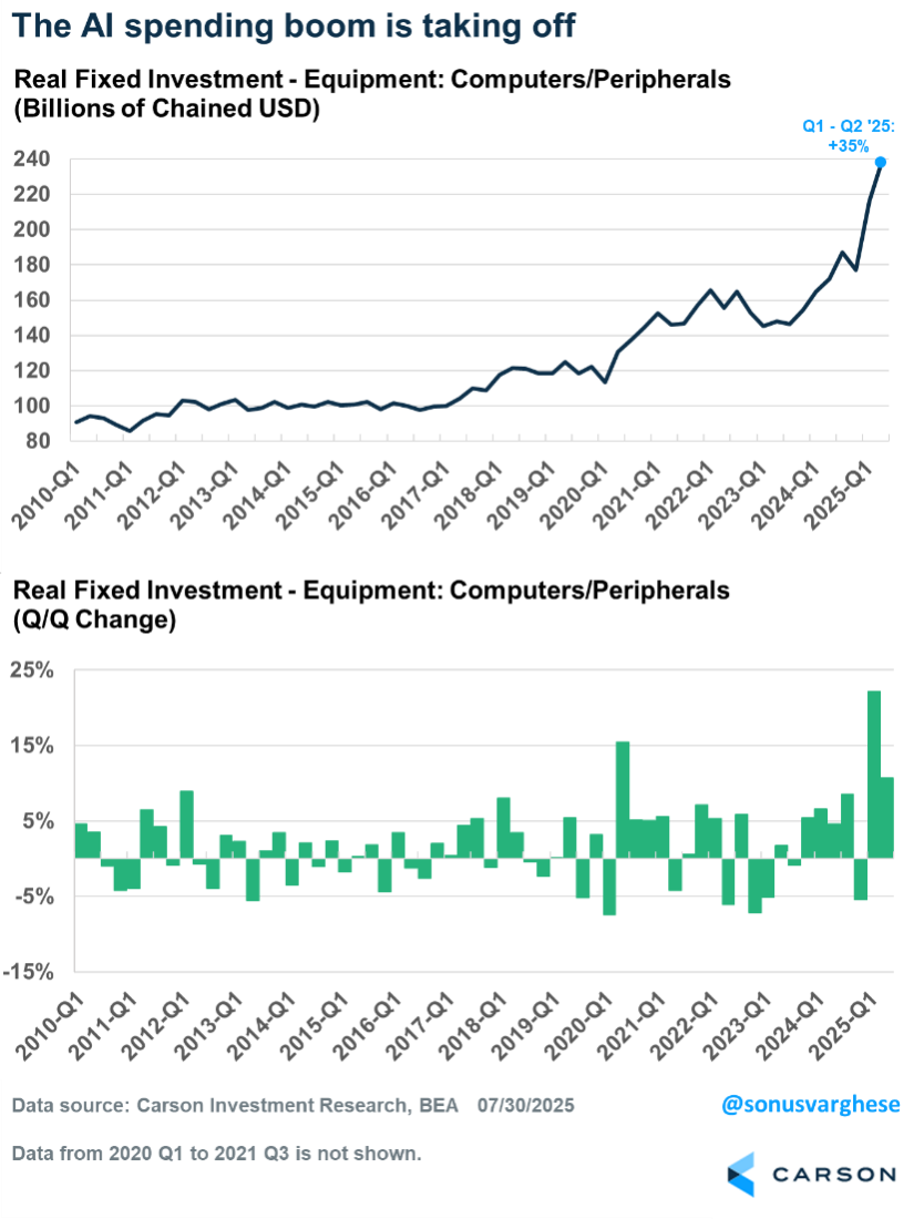 AI spending has started showing up in some of the macroeconomic data in a big way. As seen in the chat below from Renaissance Macro using BEA data, spending on artificial intelligence (both IT hardware equipment and software) contributed an average of 1.0%-point to GDP growth over the last two quarters. That’s more than the contribution of 0.7%-points from consumption (consumer spending). For perspective, consumption makes up 68% of the economy whereas IT equipment and software make up just over 4%.