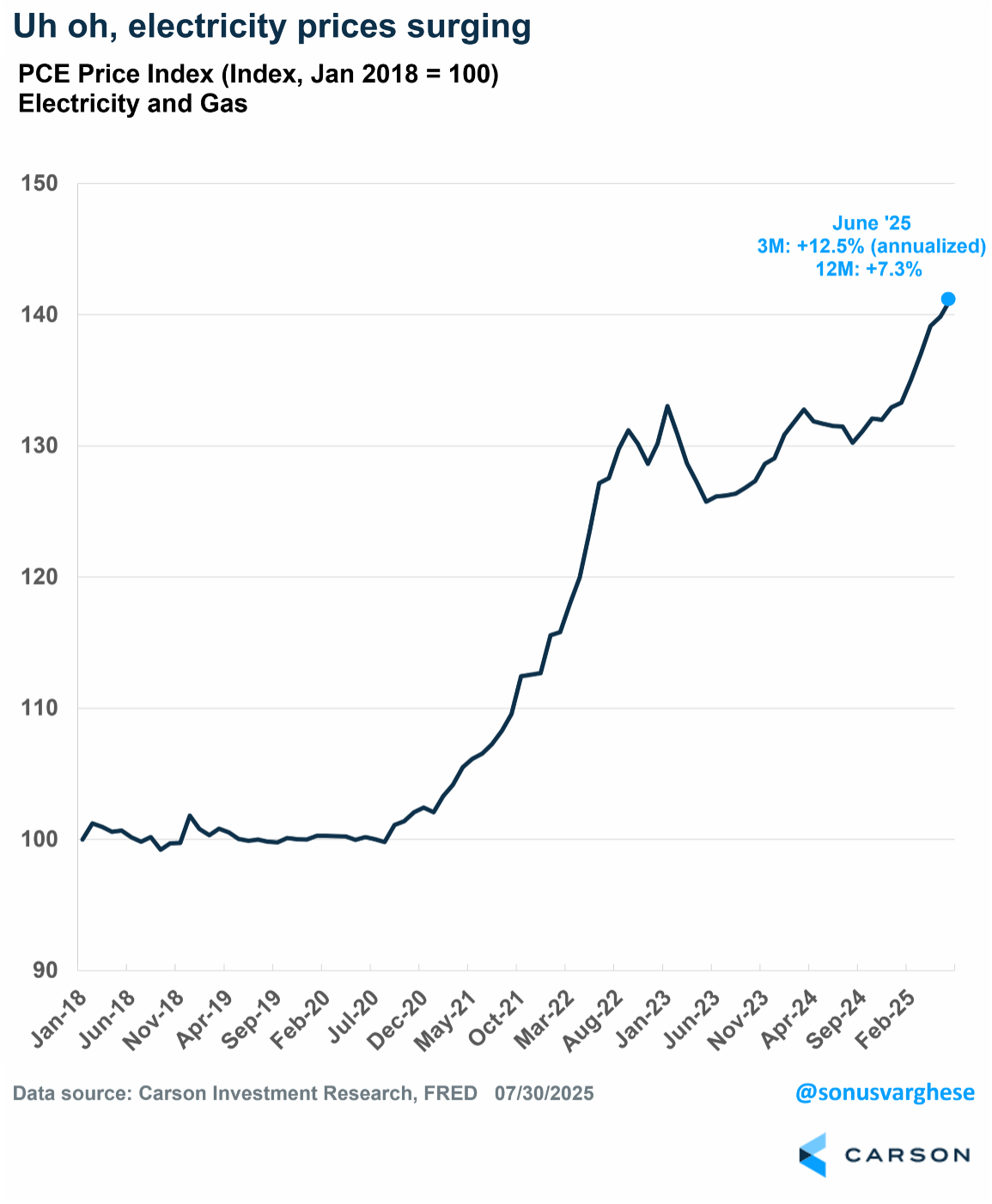 Electricity demand is surging, but supply is not keeping up. As a result, electricity prices are rising quite rapidly. Household electricity and gas prices rose at an annualized pace of 11% in June, and 12.5% over the last three months. The recent surge looks exactly like the surge in the AI equipment spending chart.