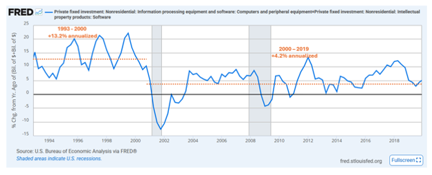From 1993 through 2000 (8 years), spending on computers and peripherals and software surged by 169%, an annualized pace of 13% per year. It subsequently pulled back by 8% over the next three years (2001-2003), an annualized pace of -2.7%. That doesn’t sound like a lot but a swing from +13% per year to -2.7% is significant. Over the 2001-2019 period, investment in this area grew at an annualized pace of just 4.2%. The chart below shows the year-over-year growth rate from 1993-2019, and you can see the step down in pace after the dot-com crash in 2000.