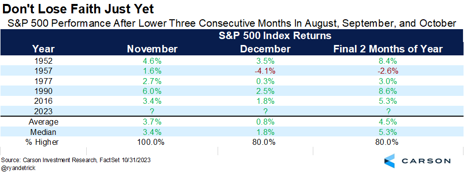 So, will we get an end-of-year rally? We still think the odds favor a rally and last week’s momentum was only the start. Some more good news: November is typically the best month of the year for the S&P 500, averaging a gain of 1.7%, with December historically strong as well. In fact, when August, September, and October are all down, such as they were this year, November has never fallen lower and December has typically been strong.