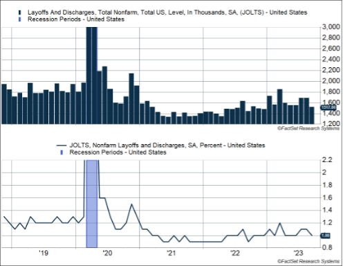 - As a percentage of employment, the layoff rate is now at 1%. Before the pandemic, this averaged 1.2-1.3%. The y-axis in the chart below is removed to show the layoff rate more clearly (layoffs surged in March-April 2020 during the pandemic).