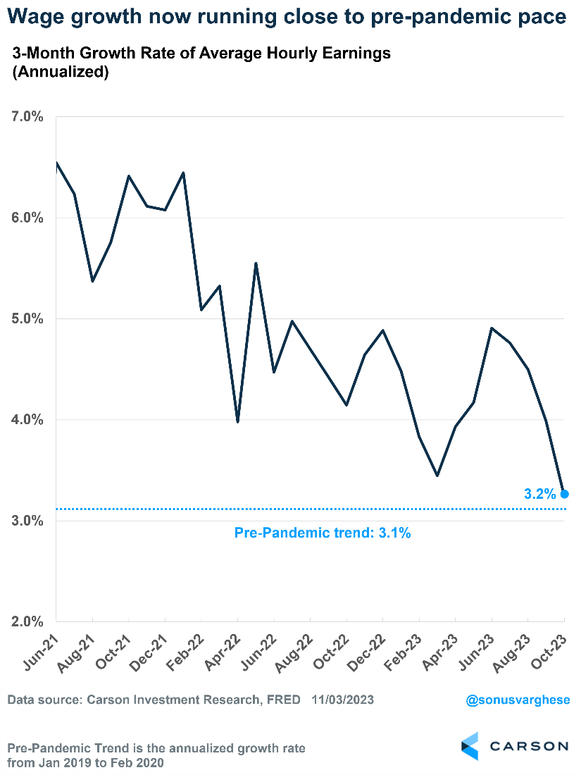 Moreover, if inflation continues to head lower, which is likely with wage growth cooling, the Fed may pivot to rate cuts by the middle of next year. Average hourly earnings have run at a 3.2% annualized pace over the past three months, almost matching the pre-pandemic pace. That’s still strong, but the Fed can likely live with it.