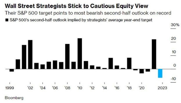 One of the reasons we expected higher prices this year was nearly everyone was saying they’d drop this time seven months ago. From a contrarian point of view, any good news could spark a big rally, exactly what has happened. Well, the more things change, the more they stay the same. Here’s a Bloomberg survey of strategists that shows this consistently bearish group is now the most bearish on the second half of the year ever. Don’t forget, it was this same group that was looking for negative returns in ’23 at the start of the year. Apparently, they are willing to double down and we aren’t sure that is so wise.
