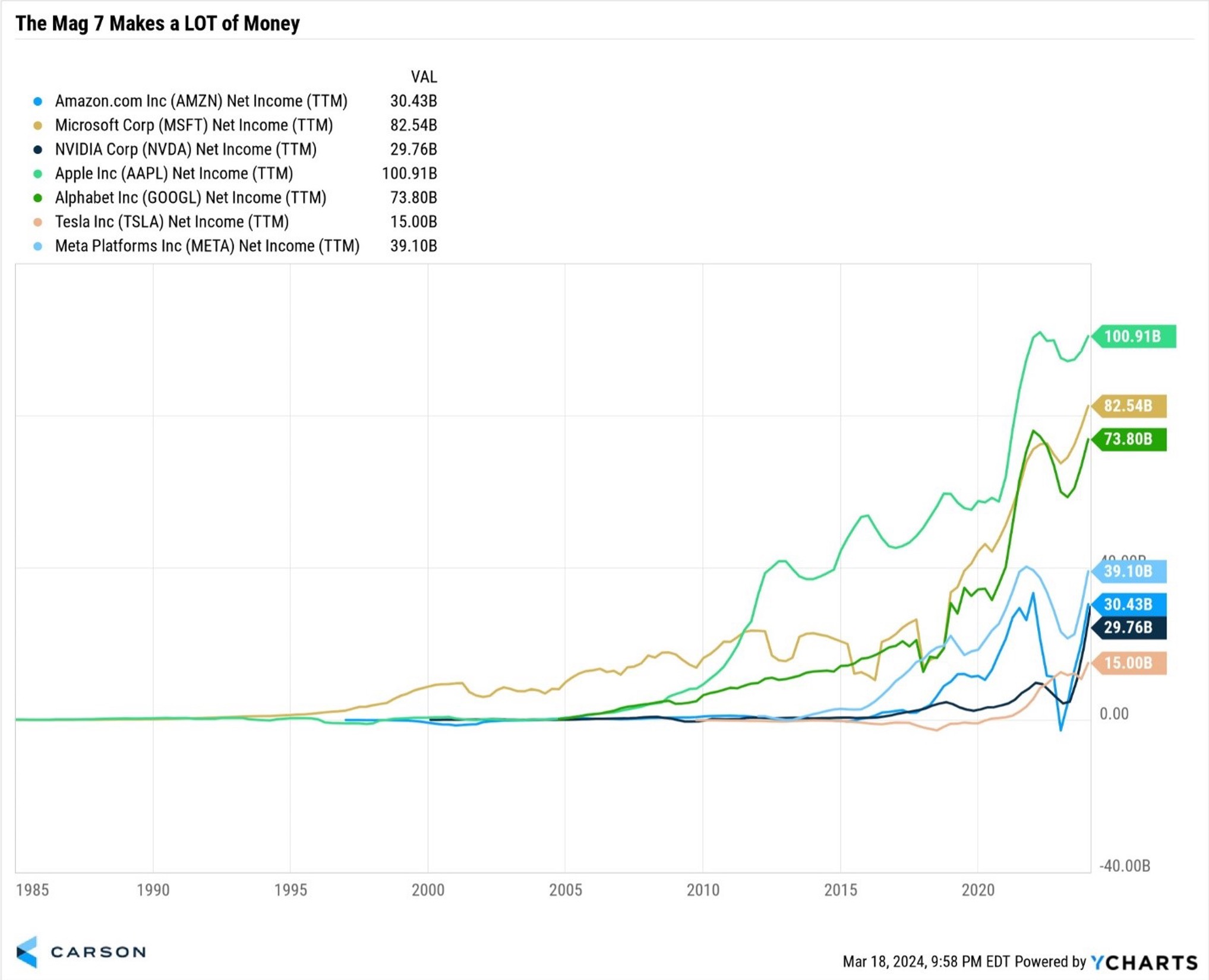 Amazon now sends customers medicine, and Apple is practically a bank with Apple Pay. In the past, a railroad stock was just a railroad stock, but that isn’t the case anymore with these large companies. Below is chart of how much these companies are making — it’s a lot of money.