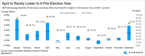 Lastly, stocks in April during a pre-election year tend to do quite well, up 3.5% on average. But the amazing part is they’ve been higher 17 of the past 18 years, up more than 94% of the time. Yet another reason to believe a spring rally is quite possible.