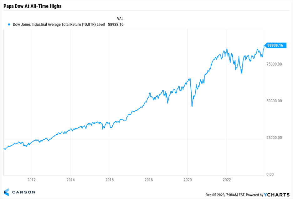 Stocks took a break last week, which was perfectly normal after a five-week win streak coming off the late-October lows. It is important to remember that stocks lead the economy, both on the way up and the way down. Various indexes are closing in on new all-time highs, and one of the most important indexes in the world is already there. The Dow Jones Industrial Average (on a total return basis) made a new all-time high last week. To us, this is the market’s way of saying the economy will continue to see solid growth next year.