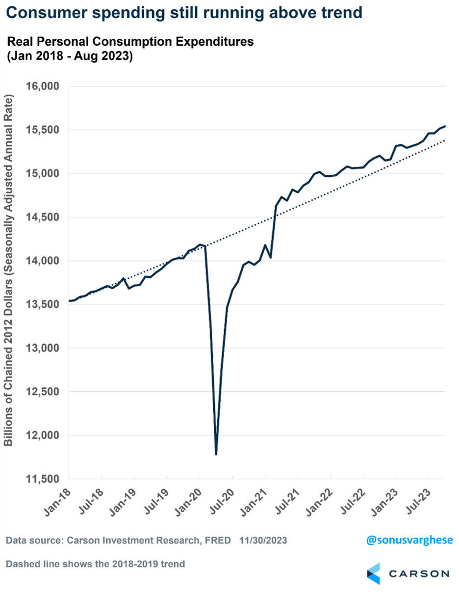 But consumers aren’t just buying airplane tickets, they are spending on many other things, too. While people might complain about the economy, that isn’t stopping them from taking trips, driving new vehicles, or updating their homes. Here’s an insightful chart that shows consumption is still running above the pre-COVID trend. That doesn’t look like a recession to us.