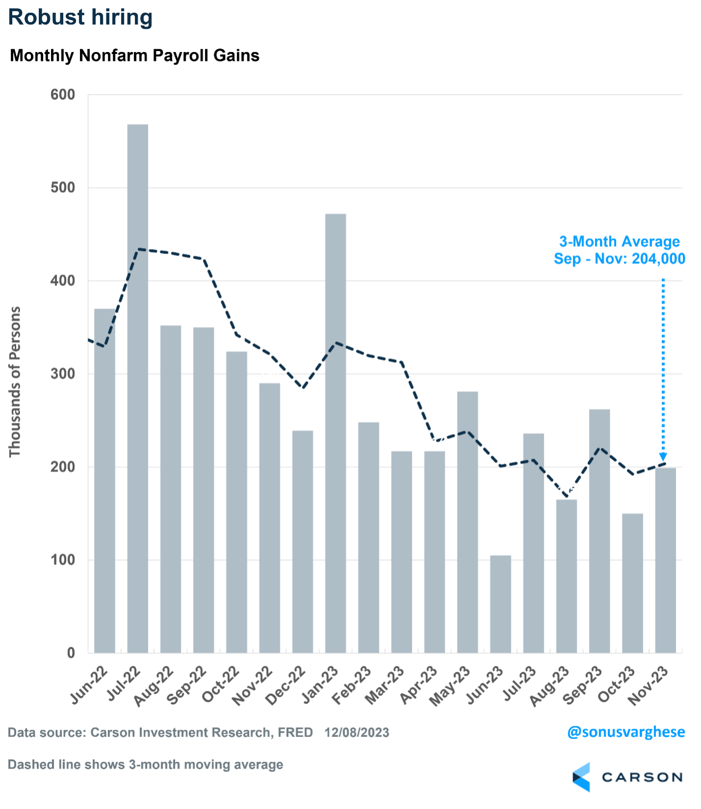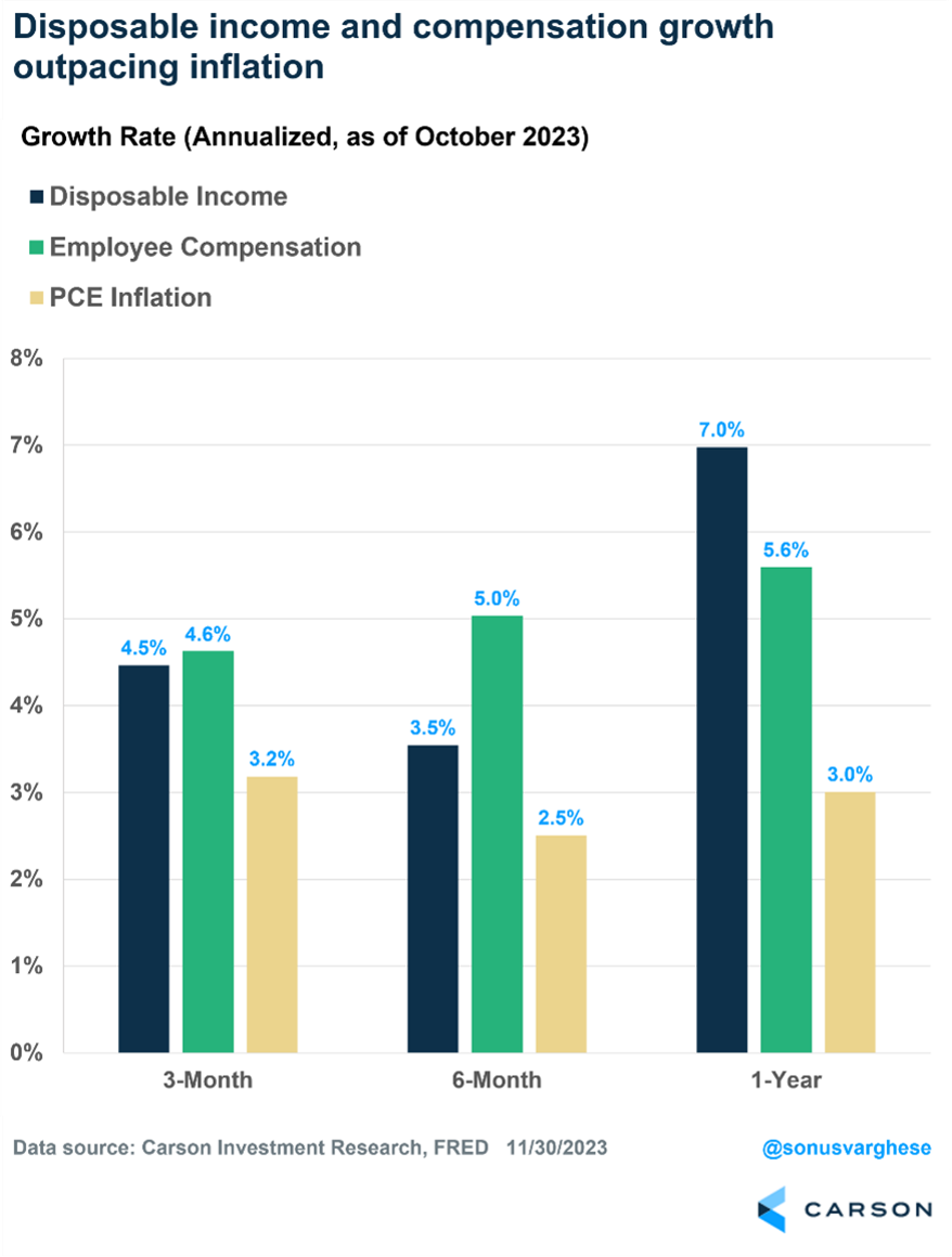 Lastly, the employment backdrop remains very strong. In fact, another 199,000 jobs were added in November, above expectations for approximately 180,000. Workers returning after the end of the autoworkers and Hollywood strikes provided a boost, but the three-month average is a 204,000 gain. For perspective, job growth averaged 163,000 a month in 2019. The economy needs about 100,000-125,000 net new jobs a month to keep up with population growth.