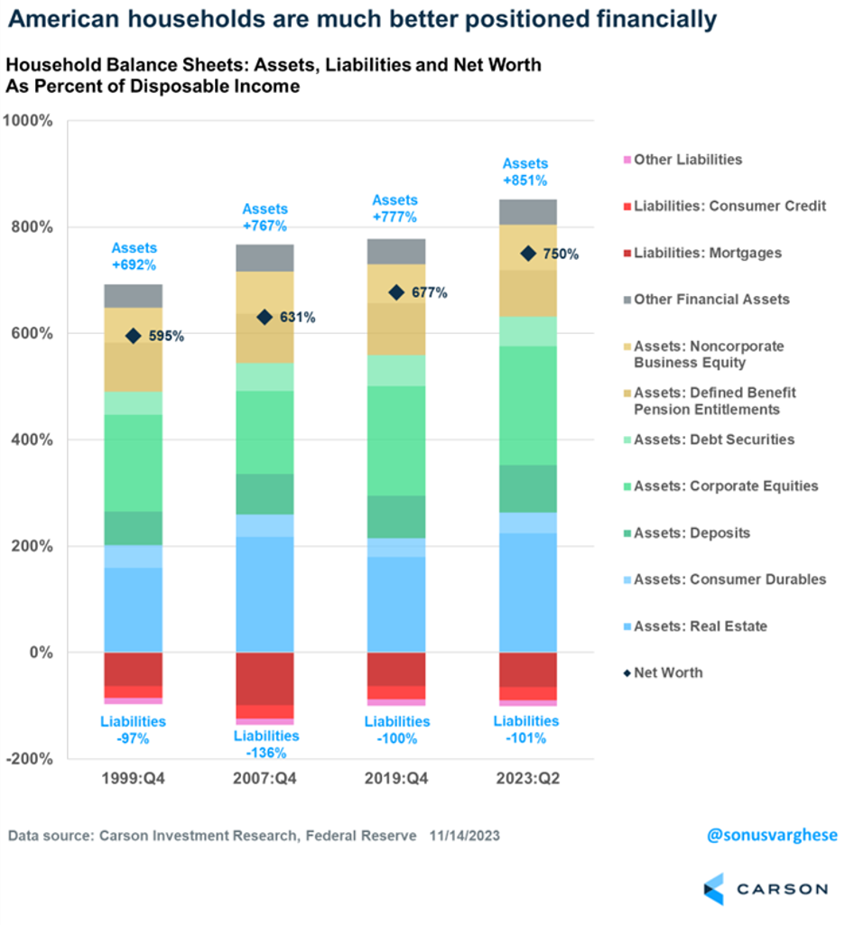 The table below shows that assets are as high as they’ve ever been, while liabilities are near the same levels they’ve been for decades. We broke this down as a percentage of disposable income to keep it consistent, but it tells a story not often told and suggests no recession is coming in 2024.