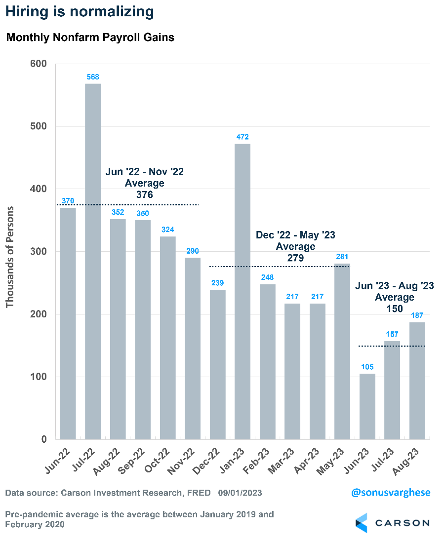 The economy created 187,000 jobs in August, which was above expectations for 170,000. These numbers can be volatile, as we were reminded by the downward revisions to prior data. This is why it helps to look at the three-month average, which is running at 150,000. That is more than enough to keep up with population growth, and it also indicates the labor market is normalizing.