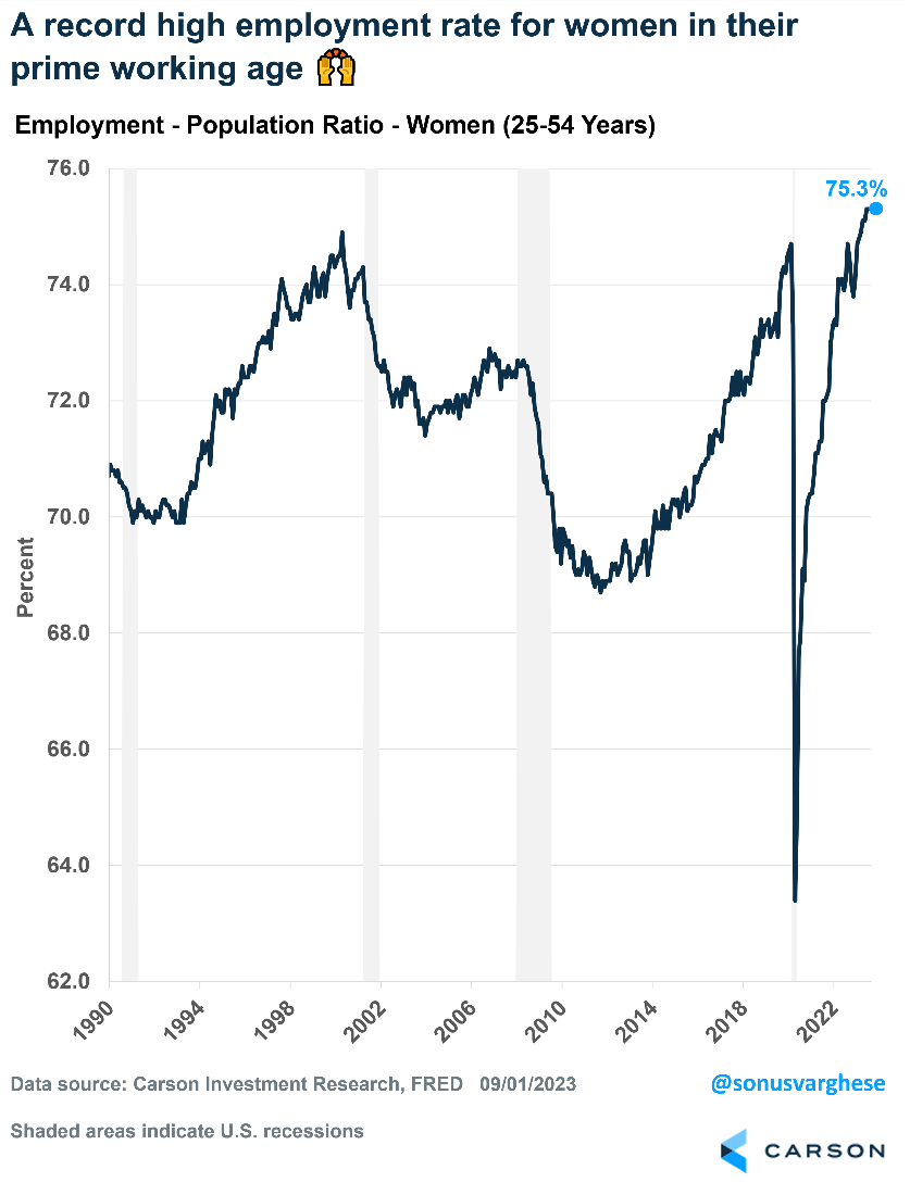 The unemployment rate did jump from 3.5% to 3.8%. But this was for positive reasons. The Bureau of Labor Statistics (BLS) counts a worker as unemployed only if they are “actively looking for work.” In August, 736,000 more potential workers came into the labor force (as defined by BLS) to look for work. That’s the largest monthly increase since January, and that would only happen if workers were confident that the labor market was strong. Usually, during weak labor markets, workers get discouraged and stop looking for work and they’re assumed to have left the labor force.