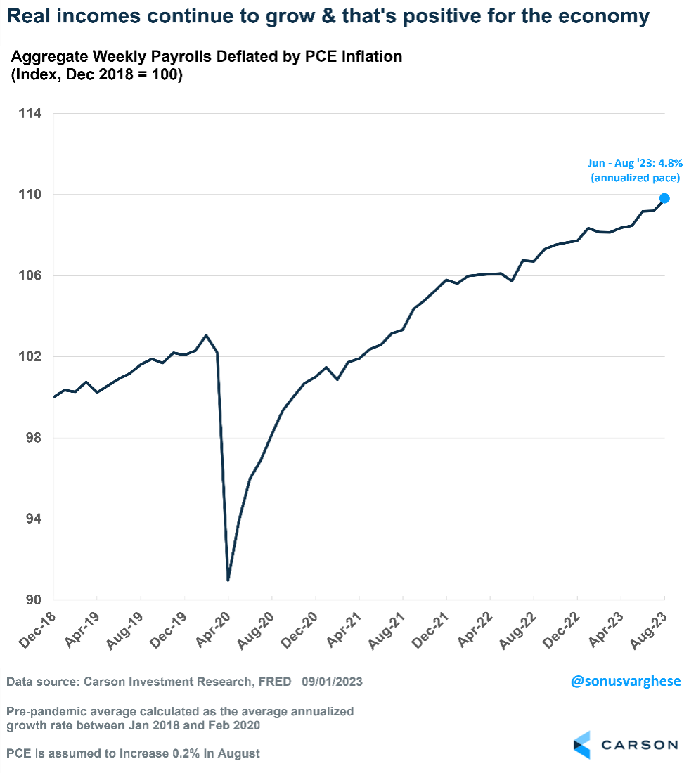 - Overall income growth remains strong, even after adjusting for inflation. That’s encouraging for consumption and the economy.