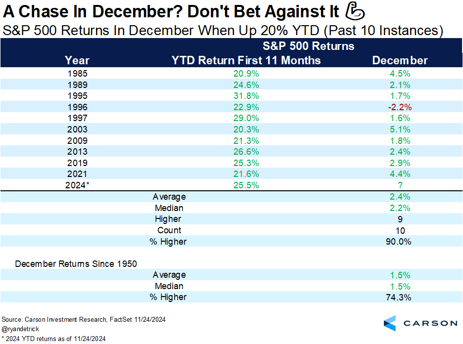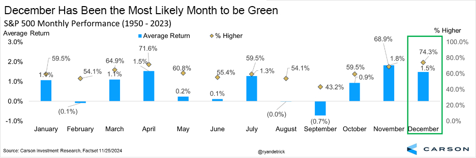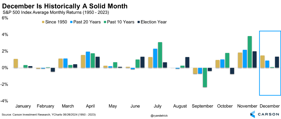 The final month of 2024 is here, and this week we wanted to show why the chance of another strong month to end this record-breaking year is likely. Here are five things to know about December.